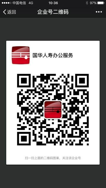 方法二:进入微信,点击右上角“+”,点击添加朋友,搜索“国华人寿企业号”,点击搜一搜,进入查看更多企业号,点击“国华人寿办公服务” 即可关注。